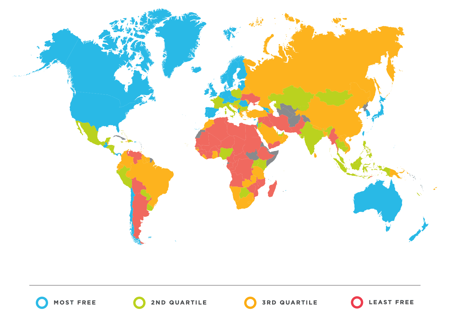 Countries that score highest on the EFW index are among the most prosperous, healthiest, cleanest, and safest places to live, according to peer review research. A lack of economic freedom condemns countries to lower incomes, greater poverty, more inequality, reduced life expectancy, fewer political rights and liberties, and bleak prospects for the quality of life.