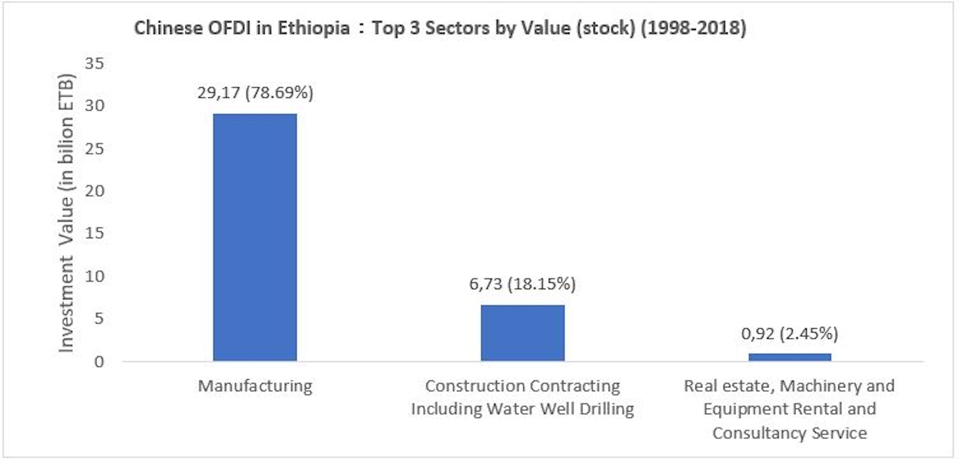 For instance, investments (stock) (2010-2018) in the manufacturing sector reached ETB 29.17 billion (about US$570million). This accounted for 78.69% of total Chinese investment by value (see Figure3).